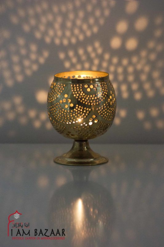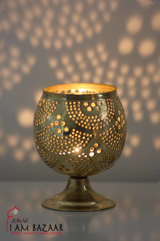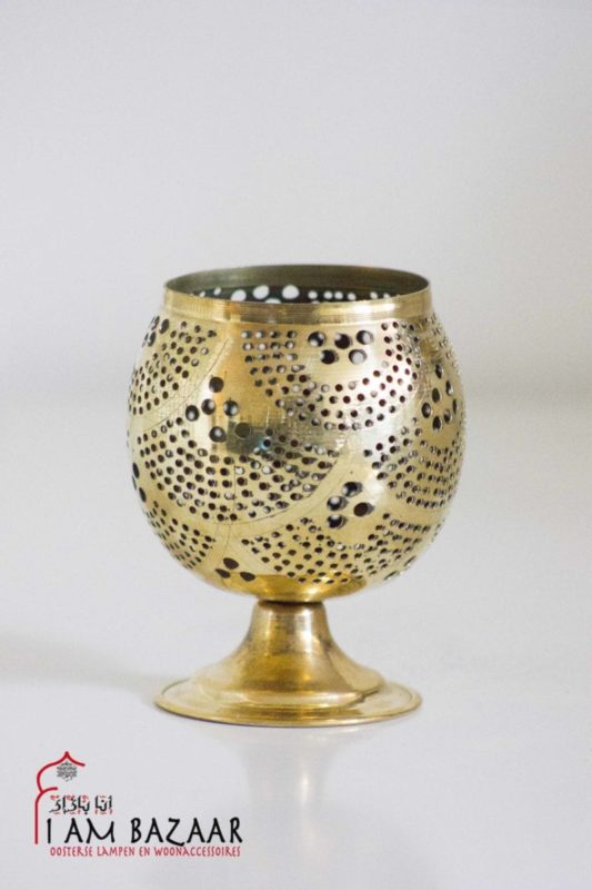 Waxinelichthouder Wijnglas met waaier patroon. De waxinelicht houder is handgemaakt In Egypte. De patronen zijn met de hand in de waxinelicht houder gemaak op dezelfde manier als de Arabische lampen worden gemaakt.